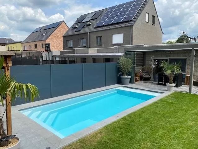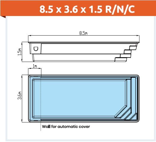 von 3,60 x 8,50 x 1,50 m, es verfügt über eine Auflage für eine Rollabdeckung sowie einen verstärkten und isolierten Beckenboden.